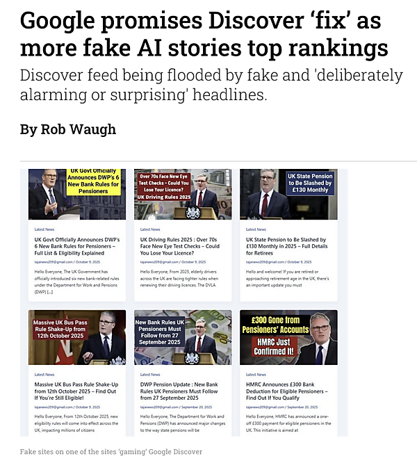 Discoverは大手ニュースサイトへのグーグルトラフィックの3分の2以上を占める重要な流入源だが、グーグルのポリシーはAI生成コンテンツを明示的に禁止していない。グーグルは大半のスパムを排除していると言いつつも、この手法には新たな対策が必要だと認めている。