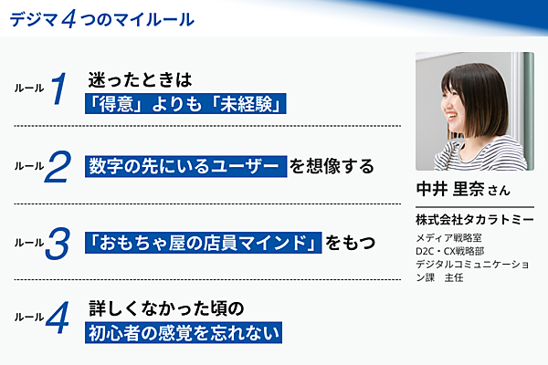 元・金融庁の国家公務員という異色の経歴をもつタカラトミーのマーケター。彼女が実践する4つのマイルールに迫る。