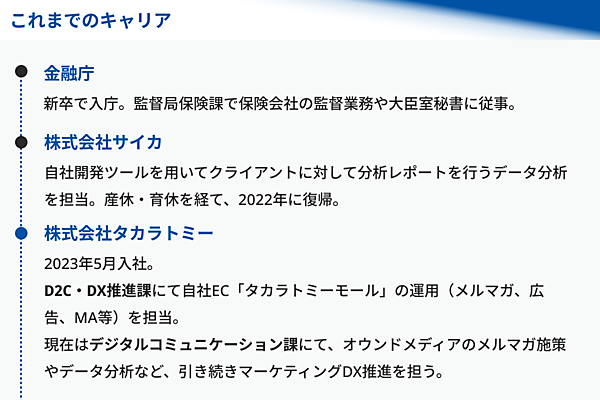 タカラトミーのマーケターである中井氏のキャリアは変化に富んでいる。新卒では国家公務員として金融庁で働き、保険会社の監督業務や大臣室秘書などを経験した。中井氏が今後のキャリアについて考え始めたきっかけは、金融機関の経営企画などの外部の人と接した際の驚きだった。