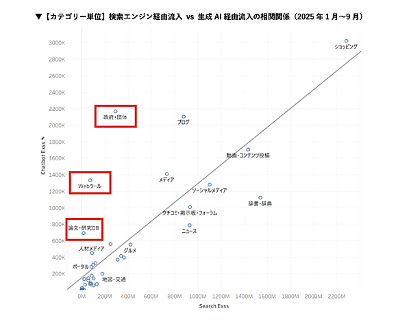 両者の違いは、何から生まれるのか。その答えは、カテゴリ単位の相関データから見えてきた。次の図が示すとおり、生成AI経由で流入されやすいカテゴリは、次の5つが挙げられる: