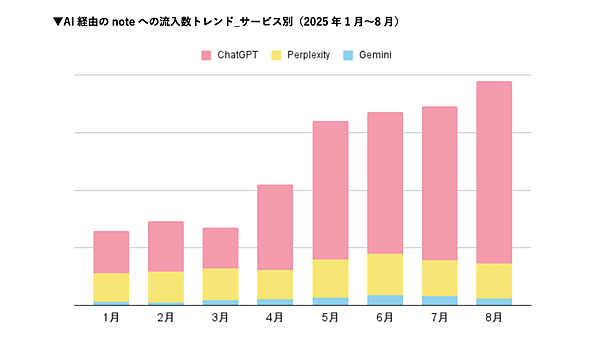 続いて、note内部による分析結果を紹介したい。noteでは、2025年3〜5月にかけて生成AI経由の流入が2.3倍に増加。さらに、8月には3月比で3倍に迫る勢いで成長した。次のグラフのとおり、急成長を牽引したのはChatGPTだ。