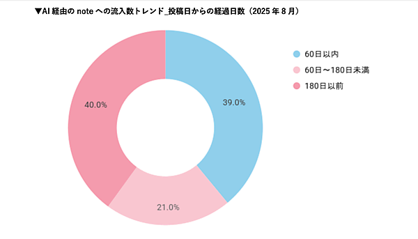 さらに、生成AI経由流入で読まれているnoteの「投稿時期」を分析したところ、約4割が半年以上前に投稿された記事だったことも判明。AIは最新情報だけでなく、普遍的な情報を求めている。つまり、過去に投稿した記事も「資産」としてストックされ、AIを通じて新たなユーザーを呼び込める可能性があるということだ。