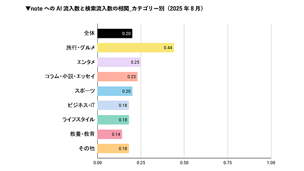 次のグラフのとおり、生成AI経由流入で読まれているnote記事を個別に見ると、「検索流入」と「生成AI経由流入」の相関関係は全体で「0.2」となった。数字は1に近づくほど相関関係が高く、「0」の場合は相関関係はまったくないという。