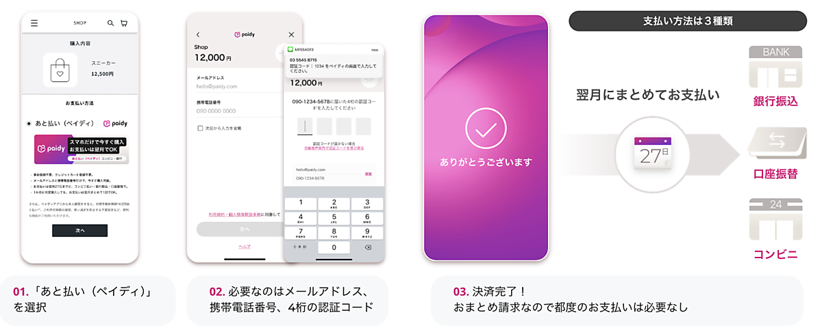 最大の強みは、手数料無料の3・6・12回の分割払い(6回以上はオプション扱いで、加盟店によって変動)と、クレジットカード不要で利用できる利便性の高さだ。携帯電話番号とメールアドレスのみで決済が完了し、決済後に「銀行振込」「口座振替」「コンビニ払い」の3つから支払い方法を決定して、手続きを行う。