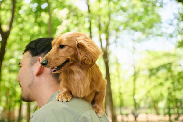 「目線の先に伝えたいものを置く」というデザインのセオリーがある。犬はピンク矢印の通り、左に視線を向けている。右にしかスペースがない状態で文字を載せると、不自然な仕上がりになってしまう。