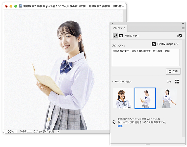 そこで第三の選択肢として生成AIを使って人物を生成してみよう。たとえば、「日本の若い女性 制服を着た高校生 白い背景 笑顔」などとプロンプトを入れて生成すれば完了だ。