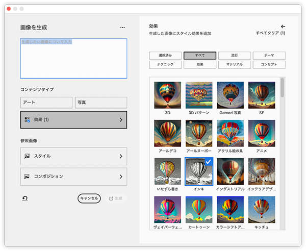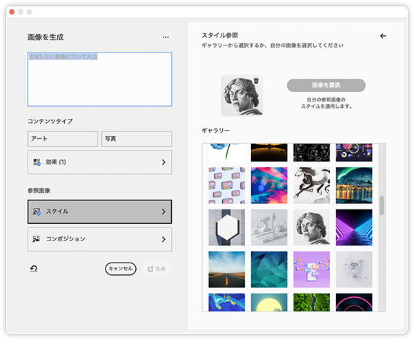 - スタイル効果、スタイルギャラリー:生成したい画像の雰囲気やテイストを言語化しなくてもいいように、サムネイルの中から選べるようになっている