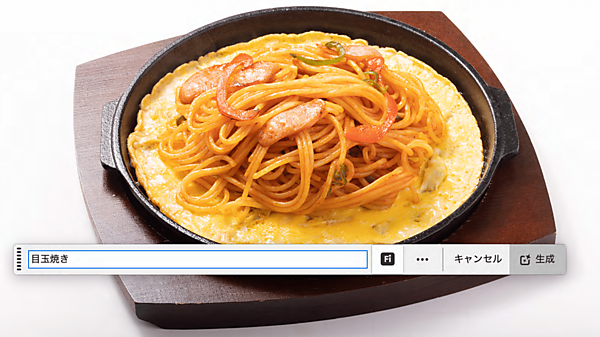ナポリタンに目玉焼きをのせたいときは、Photoshopの投げ縄ツールで選択範囲を作り、「目玉焼き」とプロンプトを入力して生成ボタンを押すだけでいい。
