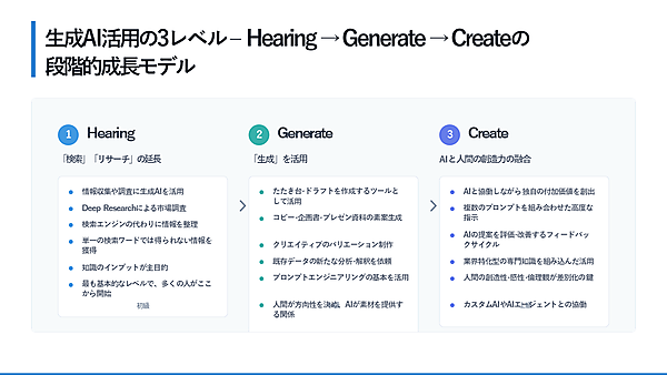 では、マーケティングでどのように生成AIを活用していくのがよいのか。生成AI活用には次の3つのレベルがあり、まずはこれらを意識してAIを活用する方法を探るとよいという。