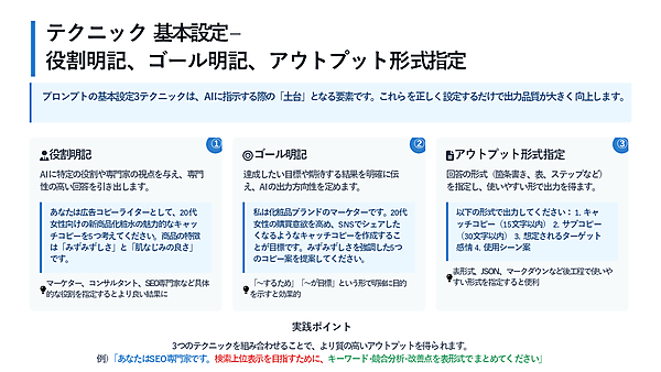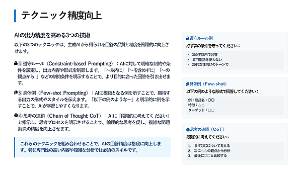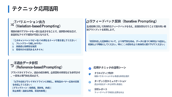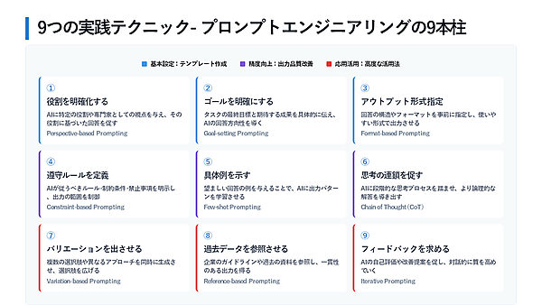 さらに9つの実践テクニックごとの具体的なプロンプト例を紹介した。以下の内容を参考にプロンプトエンジニアリングのスキルアップに取り組んでみて欲しい。