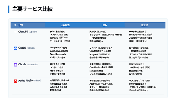 なお、生成AIサービスには、それぞれ得意・不得意があるため、目的に応じて使い分けることが必要だ。