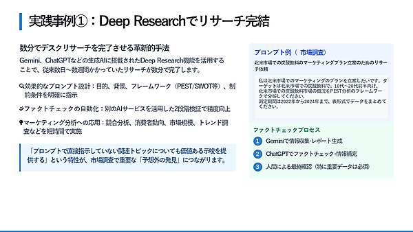 続いて、馬渕氏は2つの実践事例を紹介した。1つ目は、Deep Researchを活用したリサーチ方法だ。競合調査やマーケット分析などに活用し、前述のテクニックを意識して磨き込んでいくことで、従来1〜2か月かかっていた作業を数時間で完了できるという。