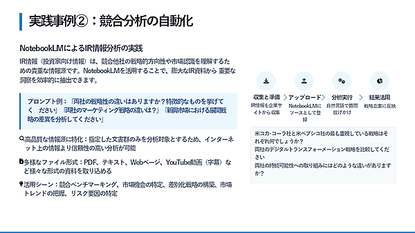 2つ目に競合分析の自動化としてGoogle NotebookLMを使ったIR情報分析方法を紹介した。馬渕氏の活用例として、飛行機に乗る前に読みたい論文をGoogle NotebookLMにソースとして登録し、音声を作成して、その音声を飛行機で聞くというTipsも紹介された。