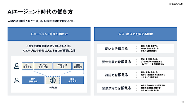 そして、AIエージェント時代の人間の働き方について、「AIを活用する上で重要なのは『入口と出口』であり、入口では問いを立てること、具体的な指示を出すことが人間の役割。中間の作業はAIが担当し、出口では人間がアウトプットを評価して実行に移すという流れが理想的」と語った。