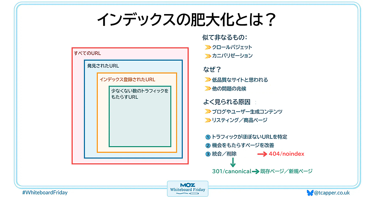 そして、問題を解決する実践的な解決法を学んでほしい。今回のホワイトボード・フライデー動画は、コンテンツの統合からURLの適切な処理まで、サイトのインデックスの健全性を評価して効果的な改善措置を講じるのに役立つ。