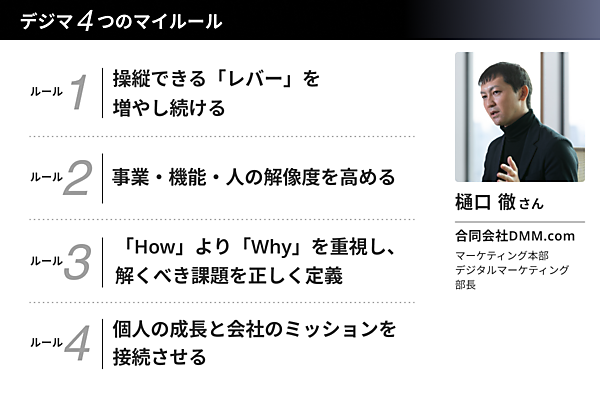 未経験の領域にどうキャッチアップし、短期間で成果へつなげるのか。デジマのキャリアを深掘りする本連載では、DMM・樋口氏にマイルールを聞いた。