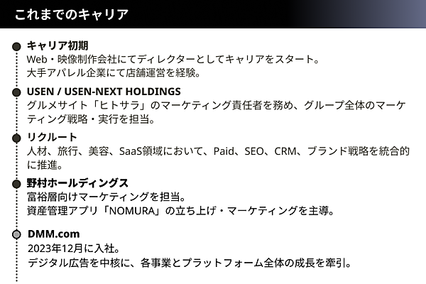 樋口氏は、USEN、リクルート、野村ホールディングス、そして現在のDMMと、複数の企業でマーケターとしてキャリアを築いてきた。そこで一貫して意識してきたのが「操縦できるレバー(=手数)を増やす」ことだ。