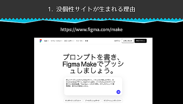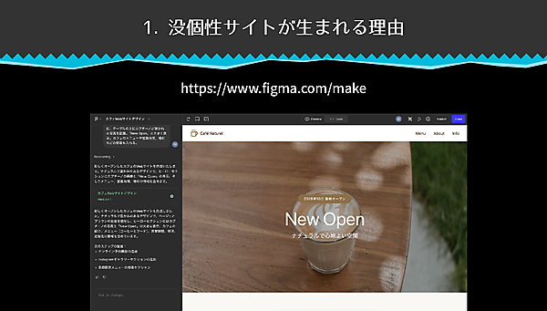 講演では、FigmaのAI搭載デザインツール、Figma Makeを使って「新しくオープンしたカフェ」のWebサイト制作の例が紹介された。自然言語で数行指示を出す(プロンプトを書く)と、わずか1〜2分でWebサイトが生成され、そのまま公開までできてしまう。
