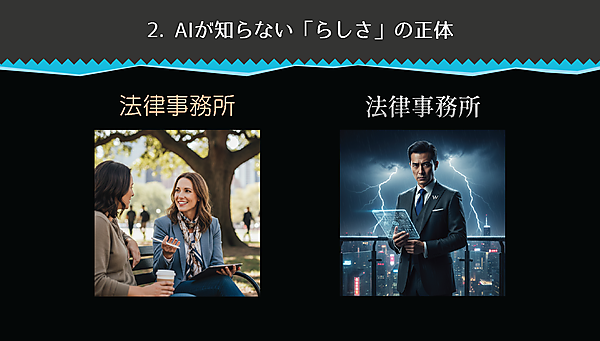 たとえば、法律事務所のWebサイトをAIに作成させると、信頼感を演出する青系の配色や落ち着いたレイアウトなど、無難なデザインが生成されることが多い。しかし、事務所の「人柄」が異なれば、デザインも変わる。