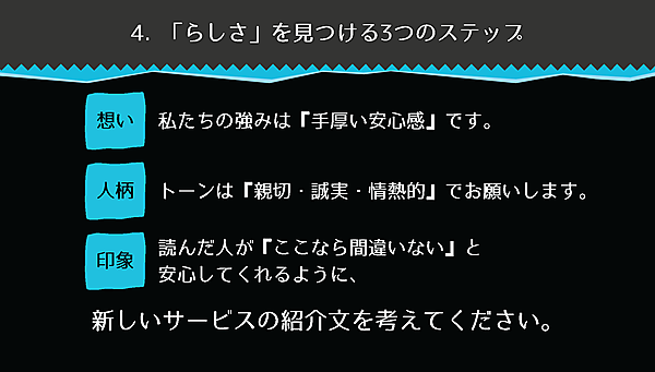 「想いの発見」で見つけた価値を踏まえて、会社やサービスの人柄を表す形容詞を3つ書き出す。これがトーン&マナーの基礎になる。
