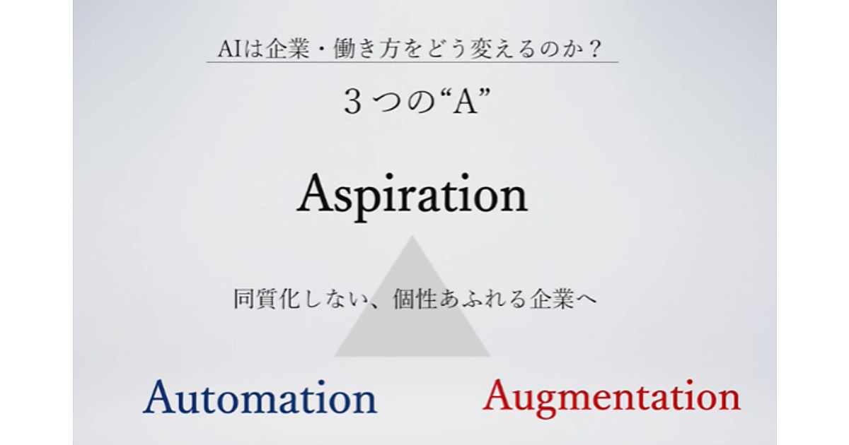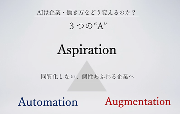 次に、中村氏は「AIの進展につれ、AutomationとAugmentationのほかに、もうひとつ新たな“A”を考える必要が生じている」と提起する。それは「Aspiration(願望・大志)」だ。なぜなら、Aspirationなしに多くの企業でAI活用が進むと、否応なしに“同質化”が進むからである。