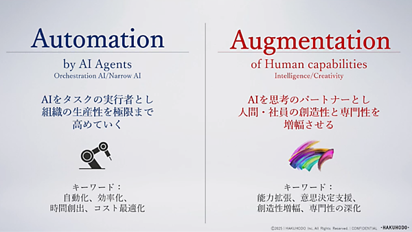 AI時代の働き方を考えるうえで、2つの“A”が大切だという。「Automation(オートメーション:自動化)」と「Augmentation(オーグメンテーション:能力拡張)」だ。前者は、「AIをタスクの実行者として、組織の生産性を極限まで高めていくか」という視点であり、後者は「AIを思考のパートナーとして人間・社員の創造性と専門性をいかに増幅させるか」という視点である。