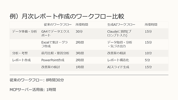 実際、生成AIを業務フローに組み込むことで、たとえば月次レポート作成の作業は次のように大幅に簡略化され、作業時間の削減効果も大きい。