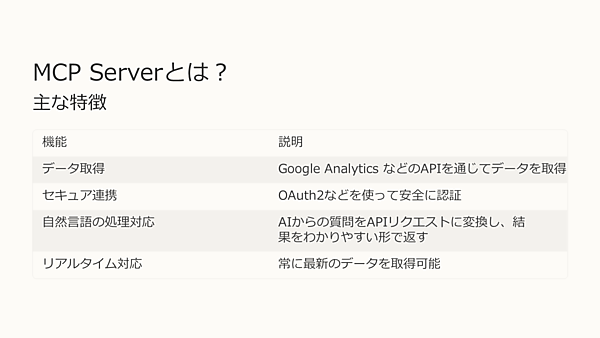 MCPサーバーとは、「Model Context Protocol(MCP)」に対応したサーバーのこと。AIアシスタントと外部データソース(Google アナリティクス、BigQuery、Google Adsなど)をつなぎ、自然言語でデータの取得・分析ができる環境を提供する仕組みである。