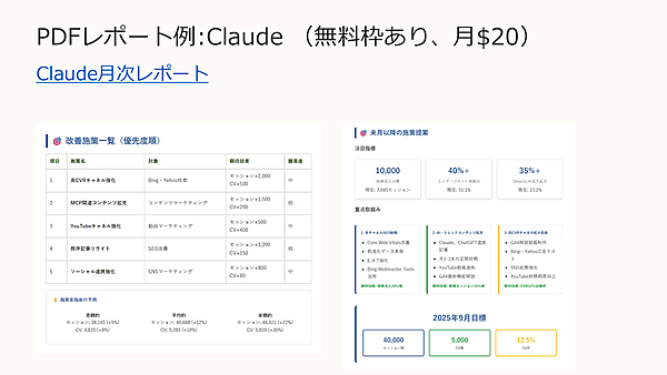 表現や構成はAIごとに異なるものの、サイト評価、前年同月比・前月比、改善施策、目標といったポイントは共通して整理されている。小川氏は、「気に入ったレポートを選び、必要に応じて情報を追加・削除しながら使えばよい」と説明した。