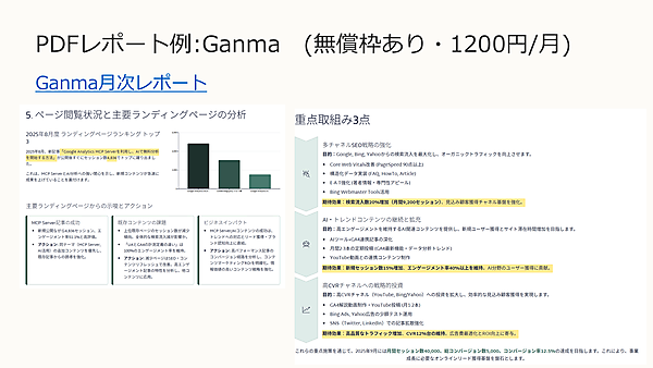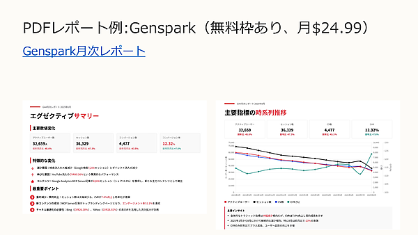決まったフォーマットでレポートを出したい場合も、生成AIが使える。講演では、同じデータをもとに Claude、Ganma、Gensparkで生成した3種類のレポートが紹介された。