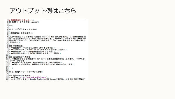 小川氏は、MCPサーバーを介してGA4と生成AIを連携し、自然言語だけで分析からレポート作成まで完結させる手法を紹介した。これは業務効率化に留まらず、施策の精度向上にもつながる、極めて実践的なアプローチだ。