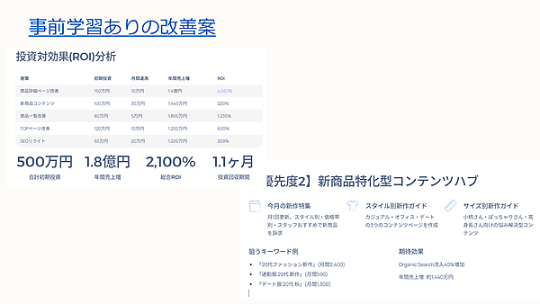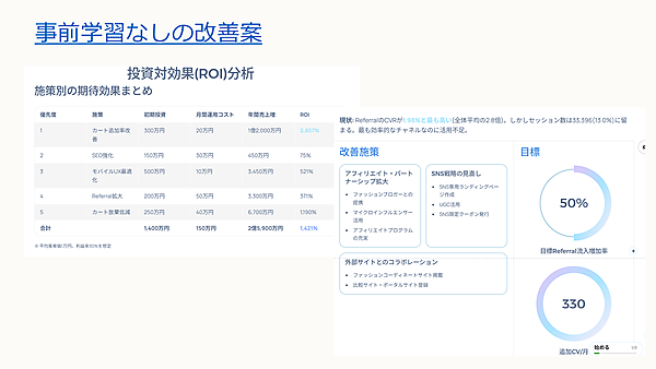 そこで、「ECサイトの特徴」「ターゲット」「目標」「実現可能な施策の範囲」などを入力すると、同じデータでも課題の本質を捉えたうえで、実現可能な改善策を提示するようになる。