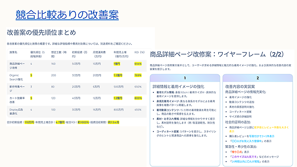 ECサイトのサマリー、改善案、優先順位、良い点・悪い点、売れ筋商品など、ひととおりの要素が網羅されている。