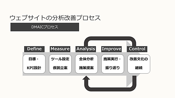 サイト改善は、DMAIC(Define、Measure、Analyze、Improve、Control)のフレームワークで進めます。