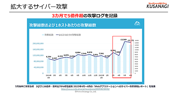 昨今、サイバー攻撃によって重大な損失を被った企業のニュースを目にし、不安を覚えている人も多いだろう。攻撃が高度化すると同時に、単純にその数も増えている。サイバーセキュリティクラウド社が発表した「Webアプリケーションへのサイバー攻撃検知レポート」によると、2025年4月〜6月の3か月で5億件超もの攻撃ログが記録されており、5月後半から明らかに急増しているという。