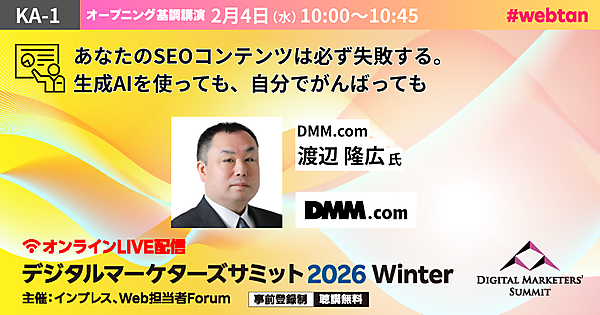 Web担当者Forumが無料のセミナーイベントを主催しているのをご存じでしょうか? 今回は、2月4日(水)に開催されるオンラインセミナー「デジタルマーケターズサミット 2026 Winter」についてご紹介します。