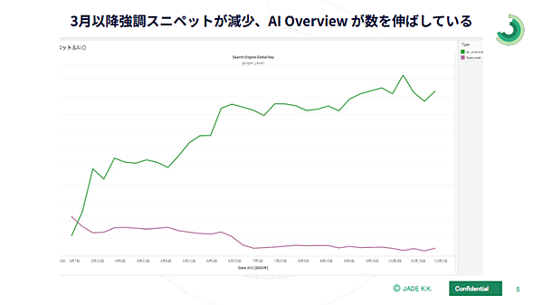 JADEの分析によると、約20万キーワードを対象とした調査で、2025年3月以降AIOの表示機会が急増した一方、強調スニペットは減少。この傾向は一時的ではなく、講演が開催された2025年11月時点でも継続しているという。