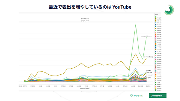 従来の検索エンジンは主にWebサイトの文字情報を収集・整理してきたが、AIの進化により動画も文字情報のように扱えるようになった。その結果、AIOでYouTubeの表出が増えたのではないかと長山氏は分析する。AIOの特徴として、go.jpやac.jpといった公共機関サイトやウィキペディアが多く表示される点も挙げられる。