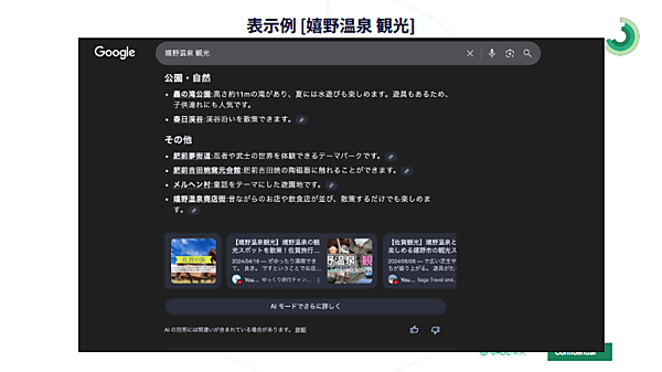 たとえば「嬉野温泉 観光」とGoogle検索すると、AIOは要約のソースとして関連するYouTube動画を複数表示する。