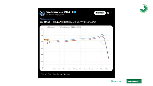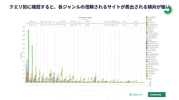 ある調査では、世に出ているコンテンツのうち半分以上はAIによって作られたものだが、人の目に触れるコンテンツは人力で作られたものがほとんど。JADEの調査でも、ある日を境にAI生成コンテンツの検索順位がガクッと下がった時期があった(長山氏)