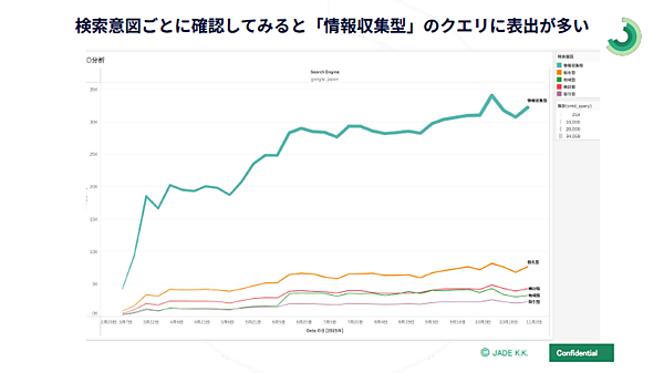 検索意図ごとにAIOの表出を比較すると、「情報収集型」での表出が非常に多いという。たとえば、「フォトブック 作り方」は情報収集型で、AIOが表示されやすい。対して、「心理テスト 当たる」のような娯楽型では表出が少なくなる。