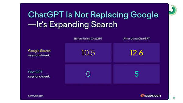 生成AIによって検索エンジンはオワコンになると言われた時期もあったが、競合分析ツール「Semrush」の調査によると、ChatGPTがGoogle検索を置き換える存在ではないことがわかる。データによれば、ユーザーはChatGPTを使うことによって、Google検索の回数がむしろ増えているという。