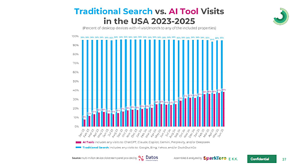 DatosとSparkToroという2社の調査データも興味深い。2023年1月頃からChatGPTなどAIツールへの訪問者は着実に増えている。しかし、Googleなど伝統的検索エンジンへの訪問者数は減少せず、ほぼ横ばいで維持されている。