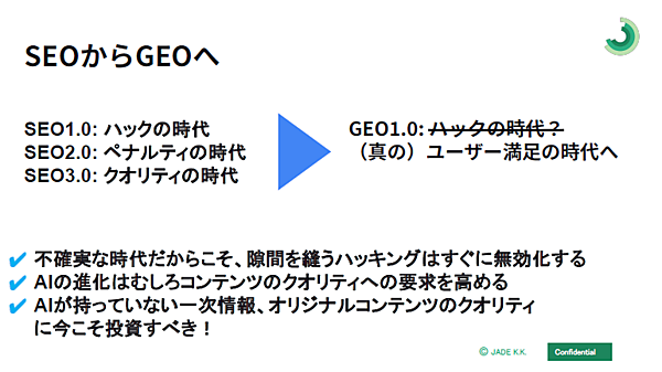 SEOからGEO(生成エンジン最適化)の時代に移るとも言われるが、懸念されるのはSEO黎明期のような混乱の再来だ。生成AIに表示されるためのハックが横行する可能性もある。