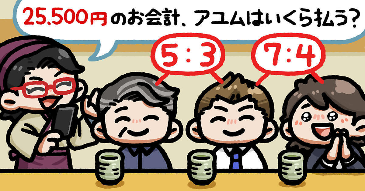 なんで僕が一番多くなるのさ。正解は35:21:12。だから、アユムさんは4,500円ね! じゃあ予約しとくね。