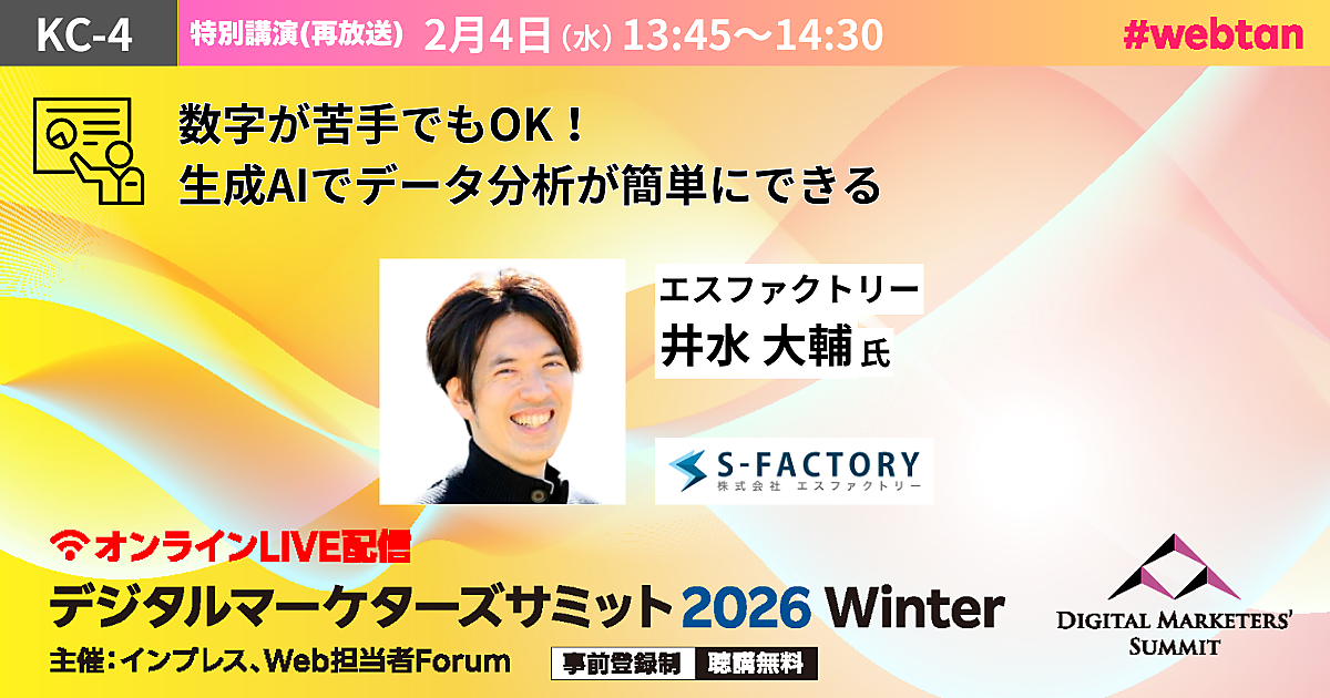DMM.com、Hakuhodo DY ONE、花王、三菱電機などが登壇する「デジタルマーケターズサミット 2026 Winter」を2月4日(水)にオンラインで開催します。