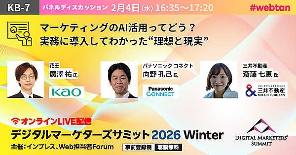 DMM.com、Hakuhodo DY ONE、花王、三菱電機などが登壇する「デジタルマーケターズサミット 2026 Winter」を2月4日(水)にオンラインで開催します。