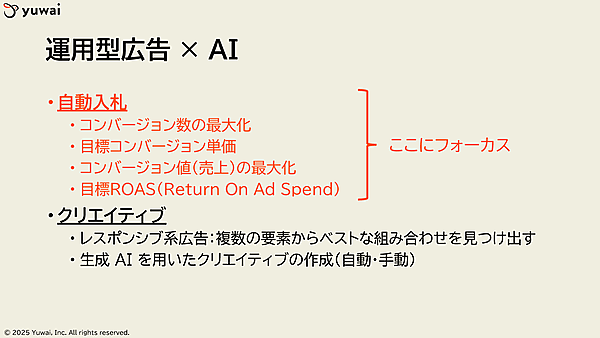 このうち、とくにAIと自動化が深く入り込んでいるのが、「自動入札」と「クリエイティブの最適化」になる。