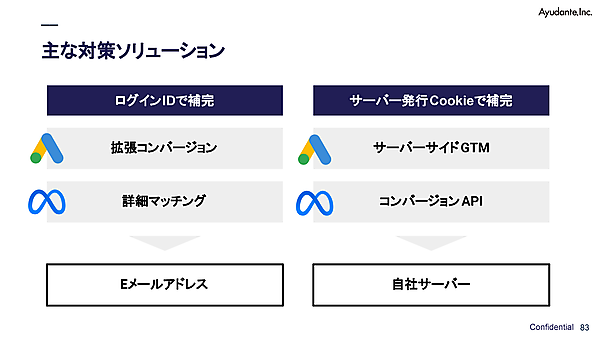 ログインIDで補完するものとしては、Googleの「拡張コンバージョン」、Metaの「詳細マッチング」があり、Eメールアドレスを広告プラットフォームにアップロードして使っていく。