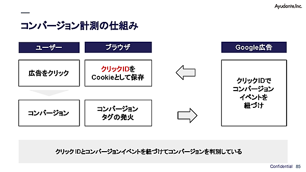 ユーザーが広告をクリックすると、「クリックID」がクッキーとして保存される。コンバージョン時にはコンバージョンタグが発火し、クッキーとして保存されたクリックIDを読み出して紐づけ、広告プラットフォームに送信する。こうした仕組みによって、コンバージョンが計測できるわけだ。